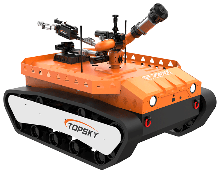 履帶式防爆機器人底盤采用鋰電池電源作為動力源,使用無線遙控的方式遠距離操控,裝載7自由度排爆機械手能實現(xiàn)不同角度旋轉(zhuǎn),機械臂可裝載爆炸物銷毀器,可現(xiàn)場摧毀爆炸物,采用履帶+單擺臂結(jié)構(gòu),能適應各種地形快速作戰(zhàn)部署。