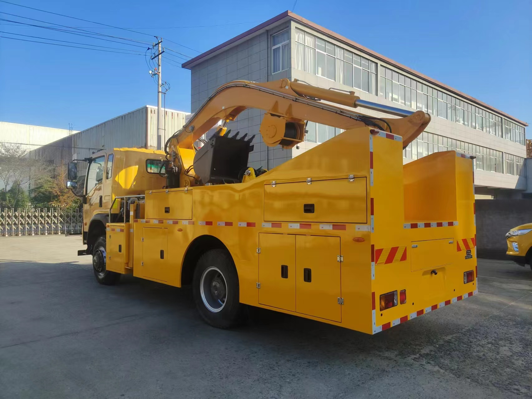 車輛配備舉升臂架、挖斗、破拆錘、抓斗、推鏟、牽引絞盤、發(fā)電機(jī)組、升降照明燈等搶險(xiǎn)裝備,實(shí)現(xiàn)多種場景的救援作業(yè);