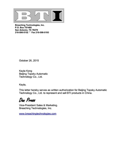2015年10月26日 ,北京凌天成為 美國(guó)BTI 公司 黑鷹撞門(mén)器 一級(jí)代理