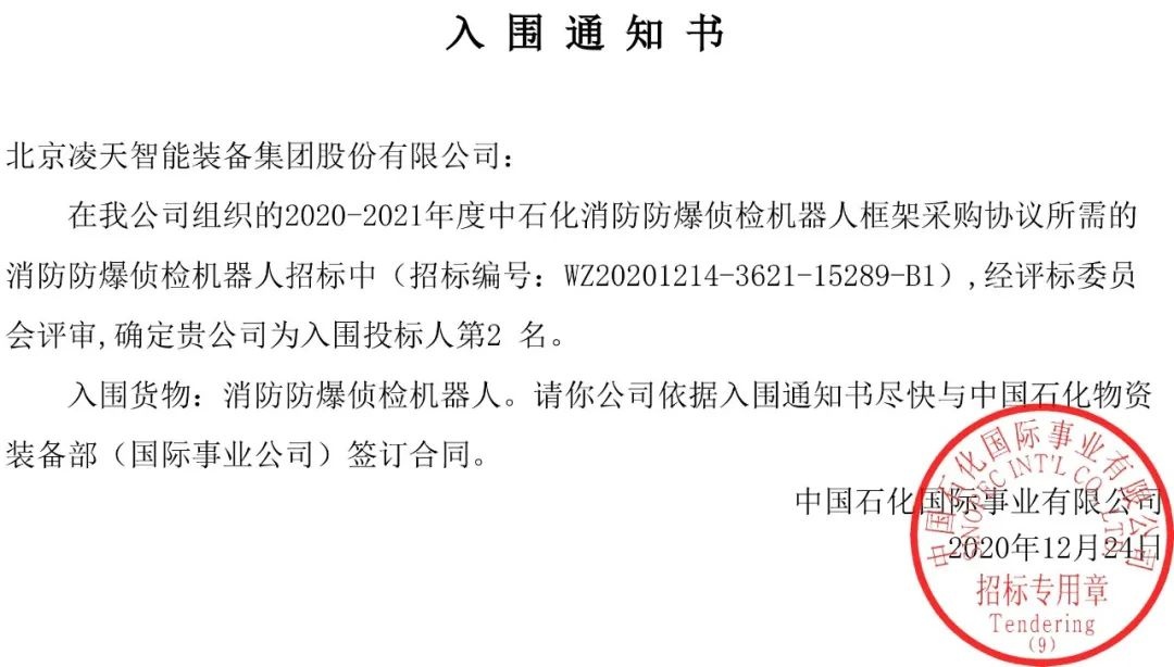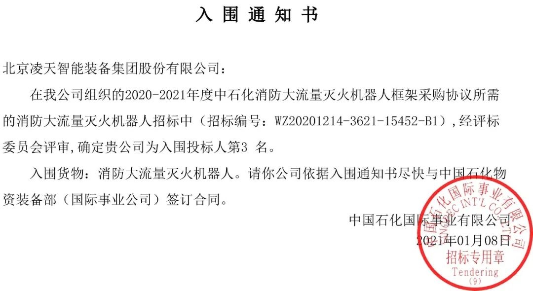 今日,從中石化天津國事了解到,北京凌天消防機(jī)器人全部中標(biāo)入圍中石化框架采購目錄。