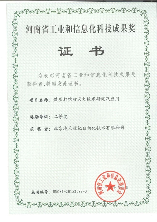北京凌天煤層打鉆防滅火系統(tǒng)獲河南省工業(yè)和信息化二等獎(jiǎng)