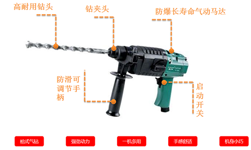 主要用于巖石,磚墻,混凝土等構(gòu)件上鑿孔,作安裝管道、架設(shè)動(dòng)力線路、安裝地腳螺栓、化工廠、精煉廠、建筑、重工業(yè)、危險(xiǎn)潮濕的隧道、水下及狹窄的空間作業(yè);尤其在高瓦斯防爆礦井中,氣動(dòng)防爆無(wú)火花更能體現(xiàn)安全性。它是提高工效,減輕勞動(dòng)強(qiáng)度的工具.