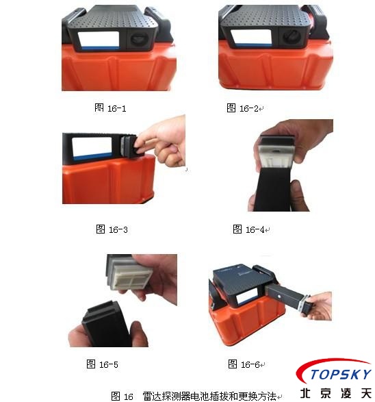 YSR25本安型雷達(dá)生命探測(cè)儀的雷達(dá)探測(cè)器配備了兩塊可充電鋰離子電池,其插拔、更換步驟如下,見(jiàn)圖16。